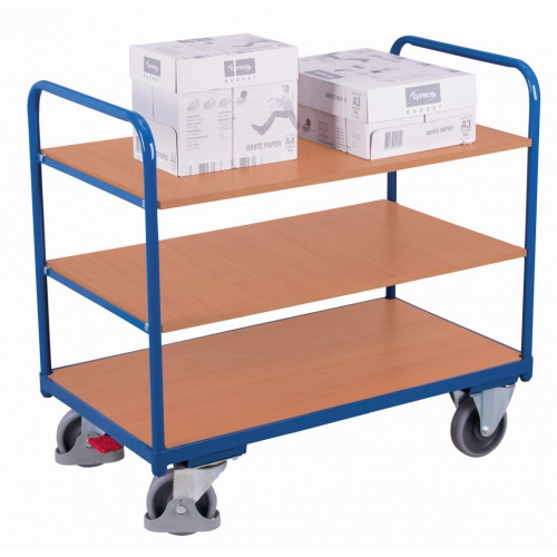 Niski wózek półkowy z dwiema półkami bez krawędzi.