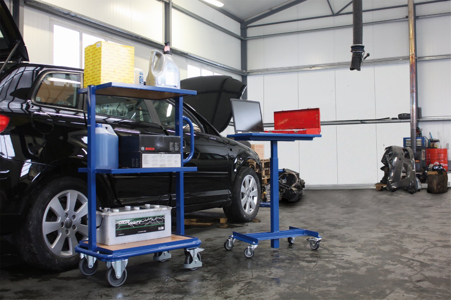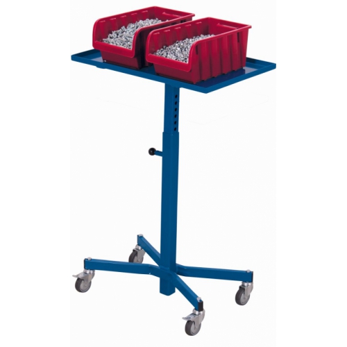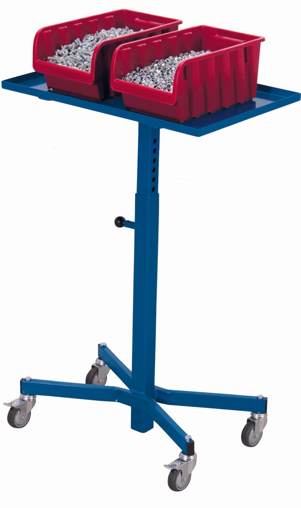 Cechy stojaka: spawana konstrukcja stalowa, powierzchnia użytkowa z krawędzią (22 mm) z krawędzią ze wszystkich stron (18 mm), regulowana wysokość 505-780, 520-800, 735-985 i 760-1.160 mm w przedziałach co 25 mm, pasujące do skrzynek Euro o wymiarach 600x 400 mm, powierzchnia użytkowa stała lub jednostronnie nachylana pod katem 15° lub 30°, blokowanie ruchomych elementów przy pomocy rygli sprężynowych, malowanie proszkowe farba RAL 5010 (niebieski), wysoka odporność na uszkodzenia mechaniczne, bieżnik z szarej gumy termoplastycznej, niebrudzący, koła z precyzyjnymi łożyskami kulkowymi, felga z tworzywa, osłona przeciwwłókienna, 4 koła obrotowe w tym 2 z hamulcem.